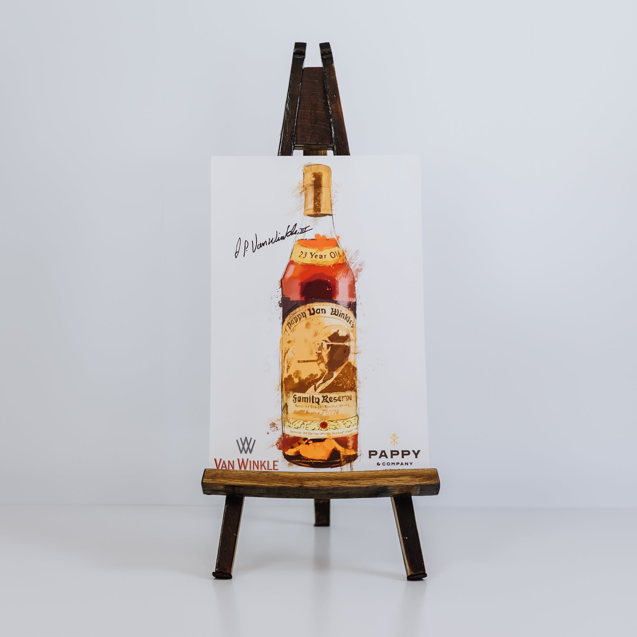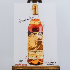 The iconic bottle of 23-Year Pappy Van Winkle’s Family Reserve, interpreted and immortalized in a painting by renowned equestrian and Louisville-based artist Tyler Robertson, is now available in poster form. Featuring a facsilimi signature by Julian Van Winkle, III, and ideally sized as an (unframed) 11 x 17 poster to hang and display in your bar, office, or kitchen for a flourish of legendary Pappy Van Winkle at home.