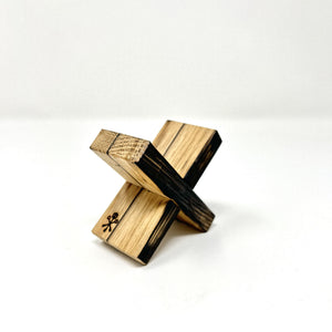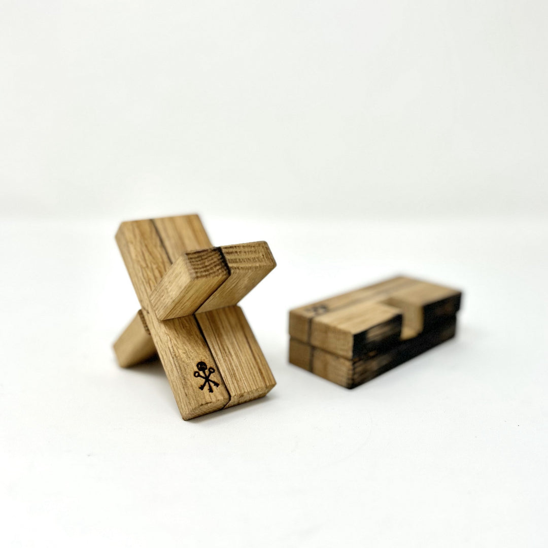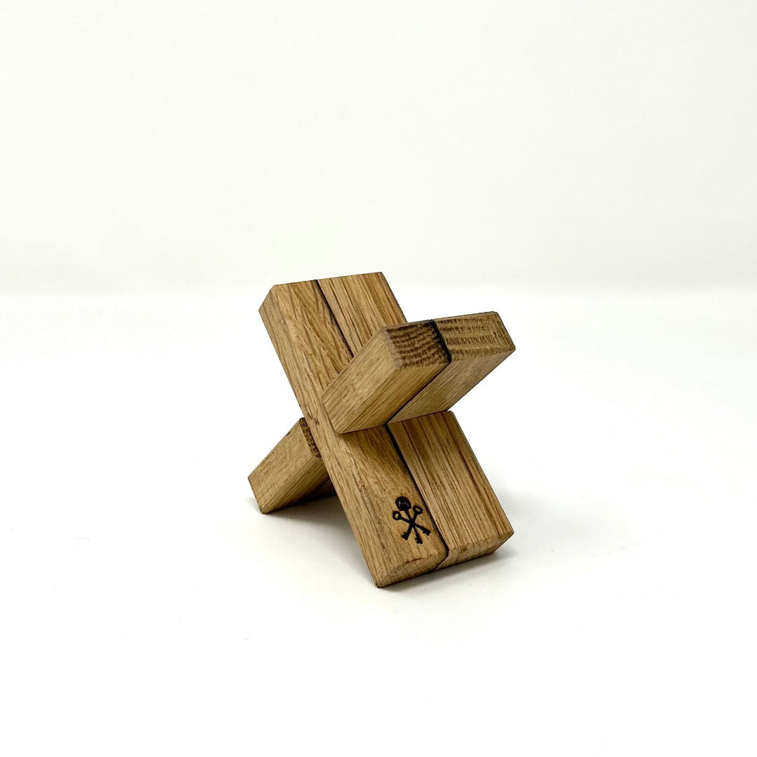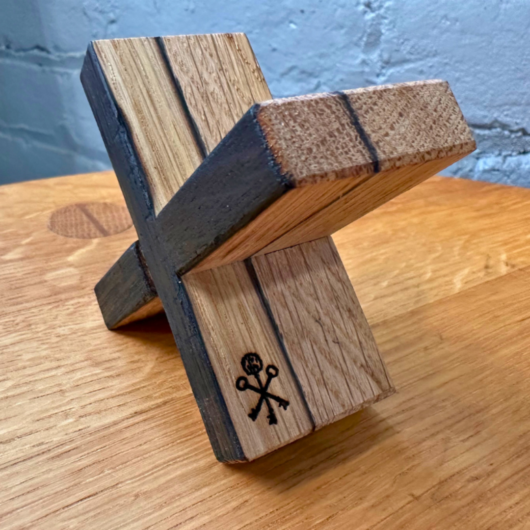 Handmade by our in-house craftsman, Jason Cohen, and designed to gently cradle your cigar, this Barrel Stave cigar rest is a distinctive and rugged accessory for the true enthusiast. Featuring the distinguishing traces and remnants of aging that remain in the retired barrel staves, the interlocking pieces of the signature X design come apart to lay flat for storage and travel. Featuring a char mark on one side and engraved with our Pappy & Company Keys logo, representing Pappy Van Winkle’s Keys to Hospitality, on the foot of cigar rest.